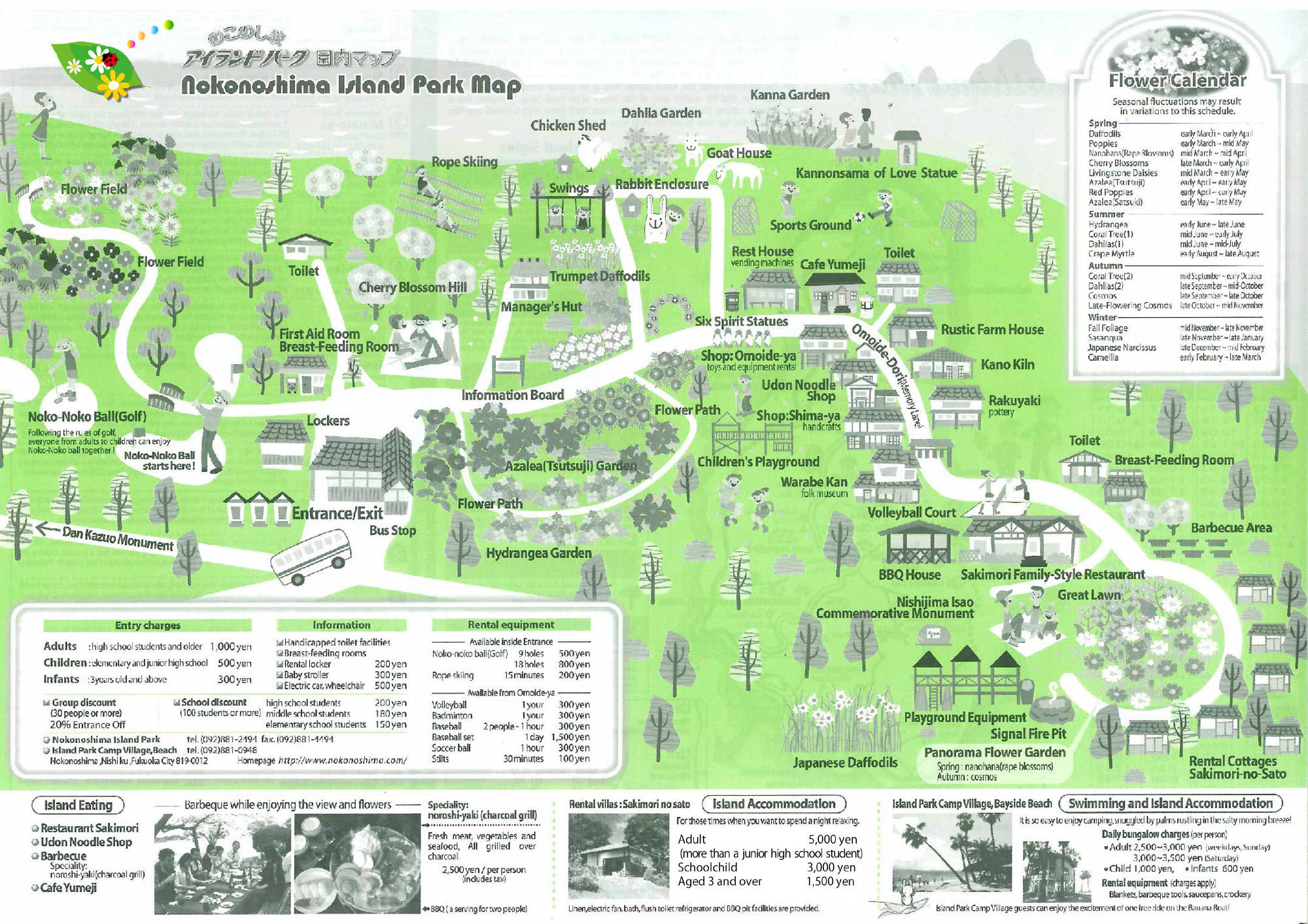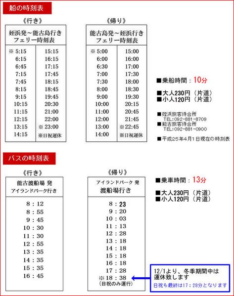 Fährpreise nach Nokonoshima Port, Einzelfahrt Erwachsene 230 ¥ , Kinder 120 ¥, Fahrrad 120¥ Bus-Gebühr vom Fähr-Port bis zum Inselpark Einzelfahrt Erwachsene 230 ¥, Kinder 120 ¥