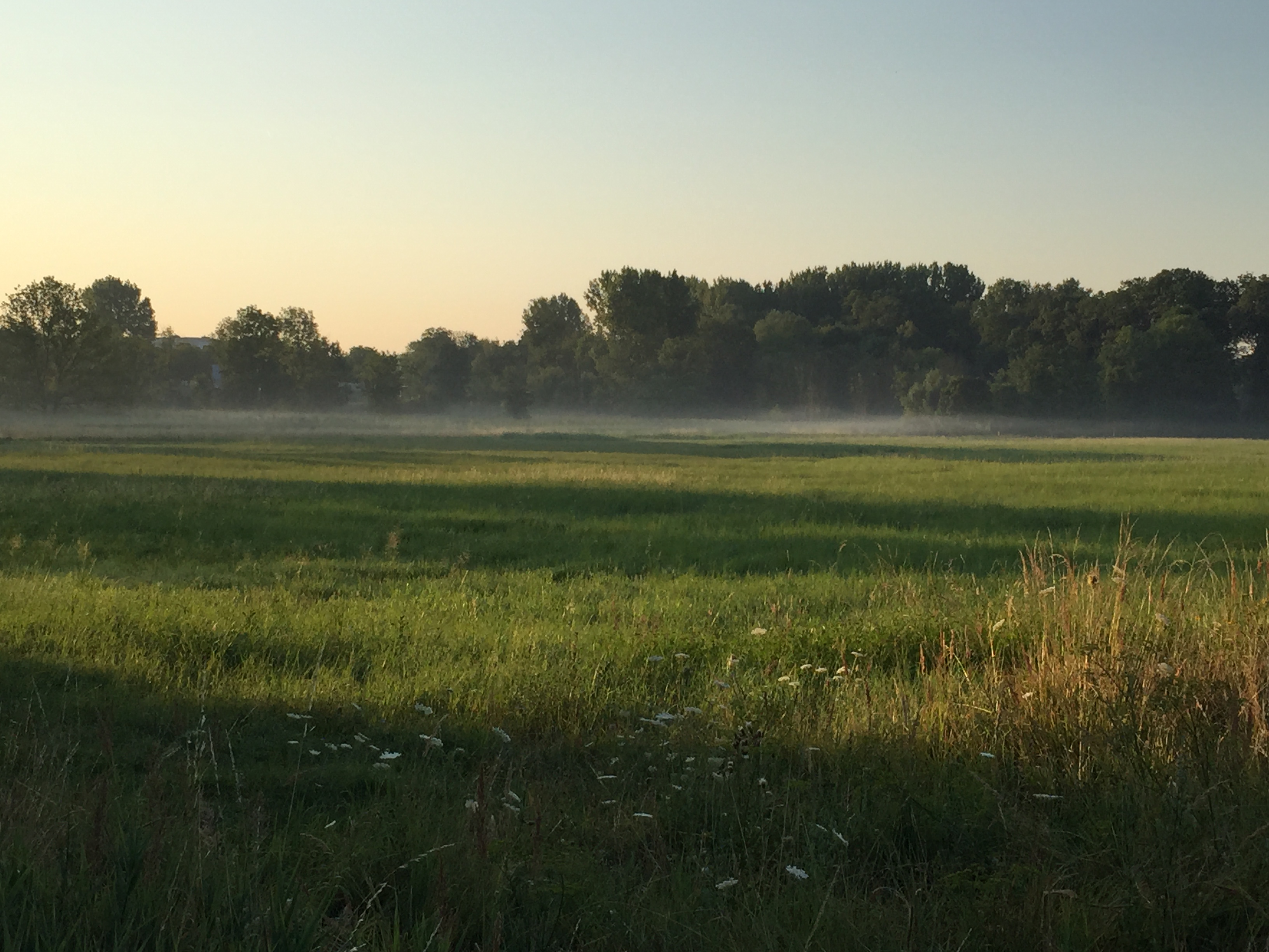 朝07:00時、ディスカウ公園の辺りの景色、ライデ川のそばにあら草原