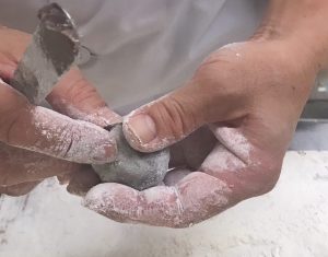 Das letzte Mal bei Taketsuru roch es, wie wenn man in Deutschland Hefeklöße zubereitet! Und auf dem Küchentisch lagen diese luftigen runden, rosaroten Klöße. Mein erster Gedanke, ich möchte einen essen. Dann: Die Dinger sind doch wirklich Hefeklöße?! Und „Konnte es denn wahr sein, dass man im entlegenen Japan deutsche Hefeklöße zubereitet und isst?!“